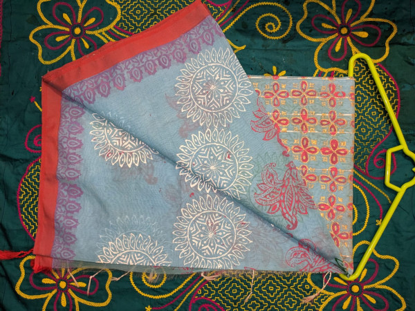 ব্লকের কাজ করা সিল্ক সুতি শাড়ি। ১২ হাত লম্বা, ব্লাউজ পিস নেই।